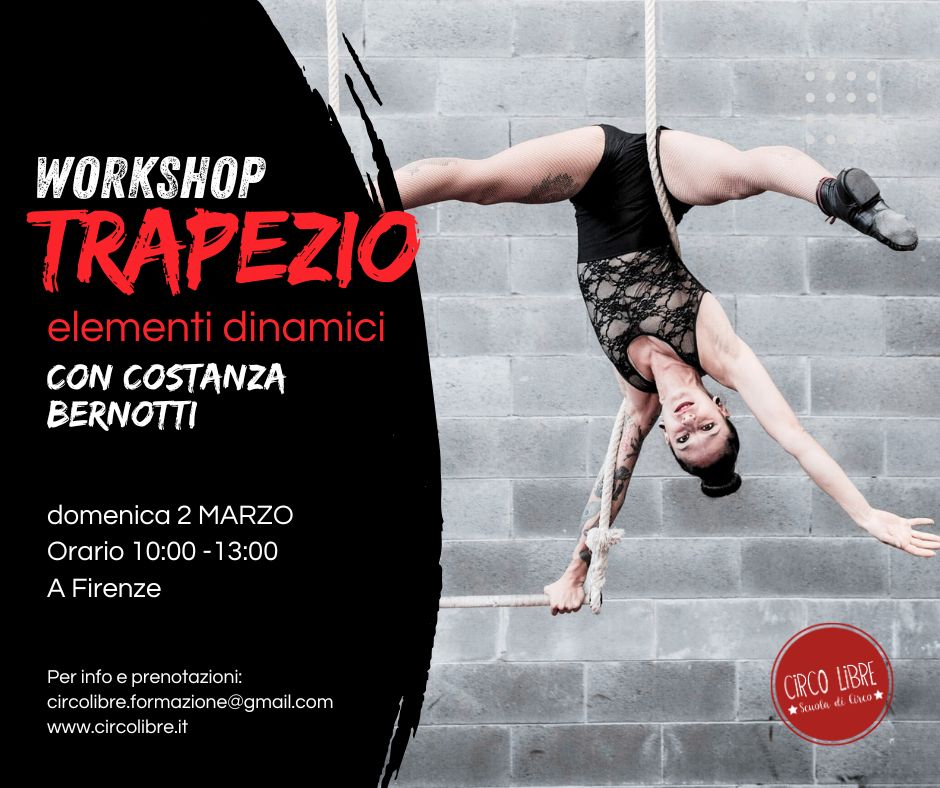 l Workshop sarà un’occasione per studiare elementi dinamici quali i diversi tipi di giri intorno alla barra, uscite dal trapezio e varie sequenze di trucchi in dinamica, approfondendo concetti quali tenute, equilibrio e sviluppo delle dinamiche di giro. Verrà data molta importanza alla propedeutica e quindi a posture corrette e varie tipologie di slanci e fouetté, alla comprensione del tempo del trapezio e all’utilizzo del peso corporeo come alleato nei movimenti, tramite anche esercizi di tecnica di trapezio ballant riportati su trapezio fisso.